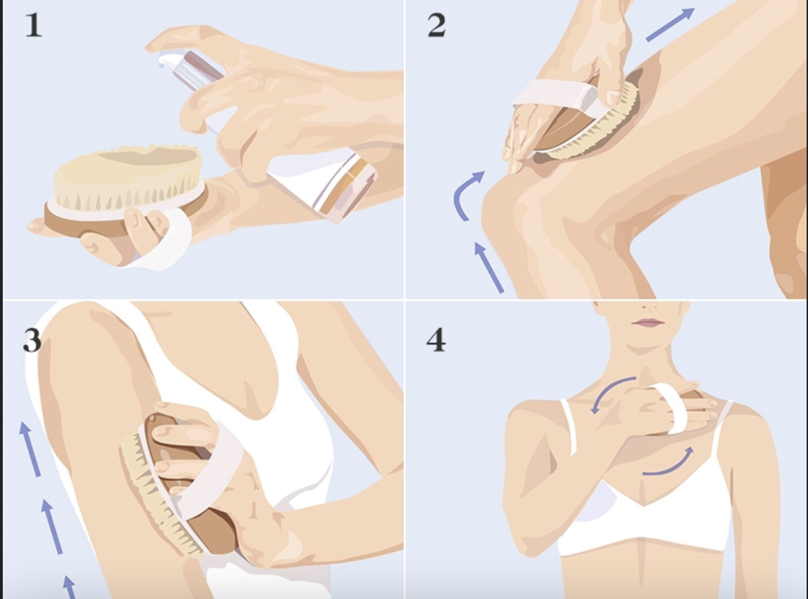 - إن أفضل طريقة لاستخدام فرشاة الجسم الجافة هي تحريك فرشاة الجسم علي الجلد الجاف باستخدام ضغط لطيف وحركات طويلة نحو القلب ( من القدمين و حتي الفخذين ، ومن الايدي إلي الإبطين ) بدلاً من الحركات الدائرية .